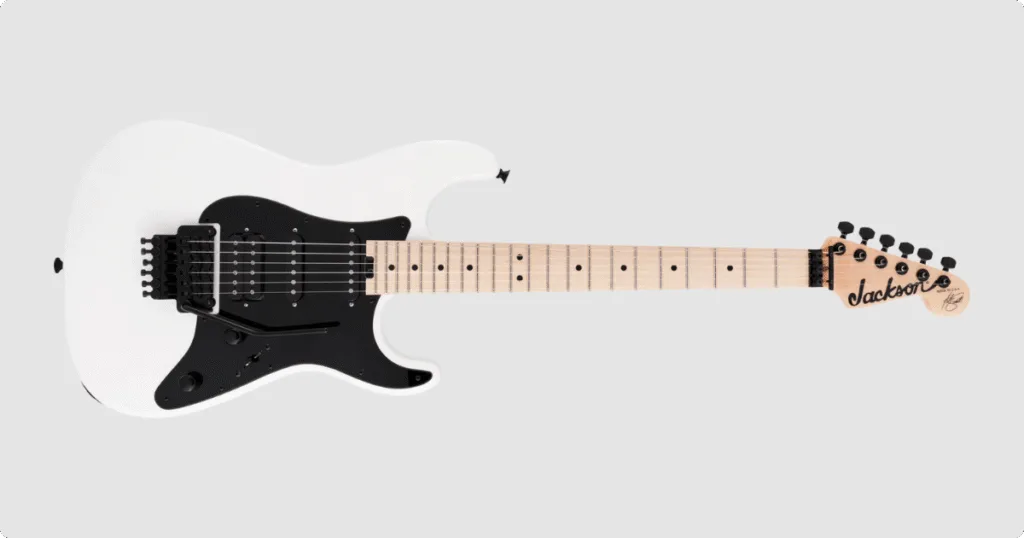 O modelo de Adrian Smith é, como esperado, o mais moderno e versátil do conjunto. A Jackson American Series Signature SC1 50th Anniversary vem com corpo em alder, braço em maple reforçado e escala de raio composto 12″–16″, permitindo riffs articulados e solos de alta velocidade.
