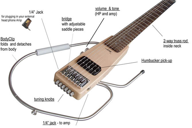 Com um formato e design tão compacto que entra até em uma mala, o instrumento possui captador integrado, controles de volume e tom, além de ser mais leve que as guitarras comuns devido ao seu corpo dobrável chamado Body-Clip (conceito formado por segmentos de tubo de aço inoxidável unidos por uma corda elástica), sendo muito fácil de transportar.