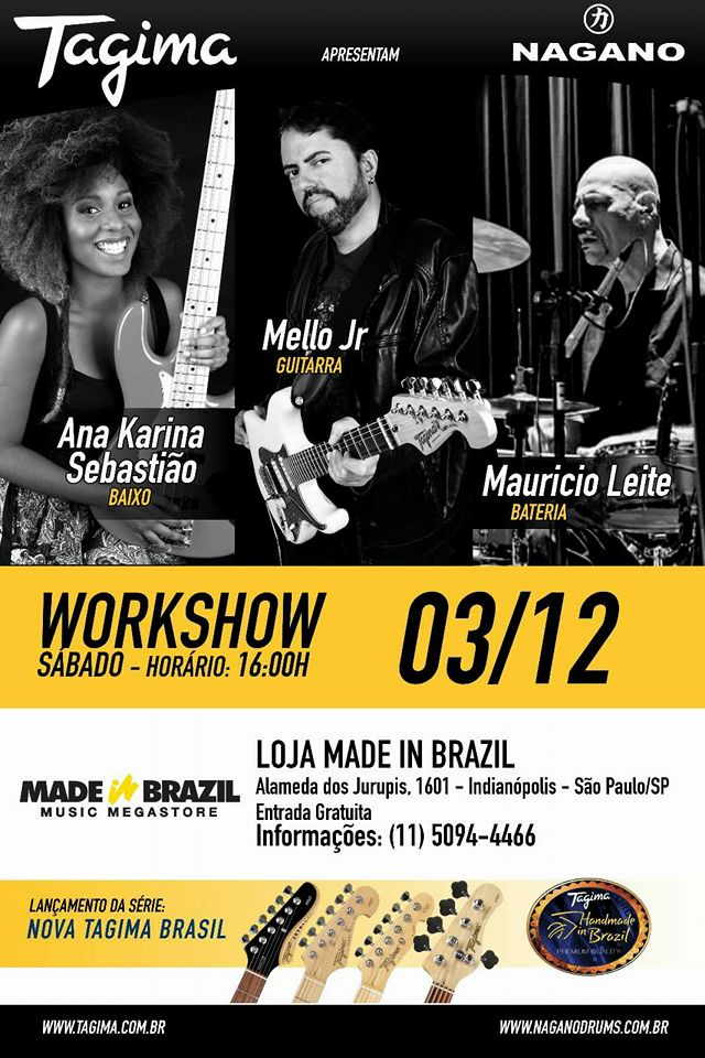 No próximo sábado (03/12), a Tagima e a Nagano realizam um workshop com Mello Jr, Mauricio Leite e Ana Karina Sebastião. O evento acontece às 16h, na loja Made In Brazil, na Alameda dos Jurupis.